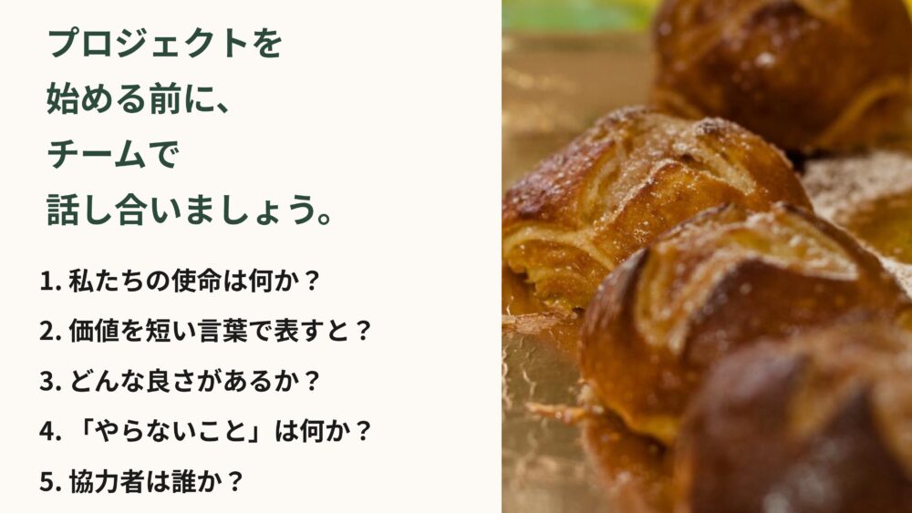 チームのみんなが同じゴールに向かって走るためには、プロジェクトを始める前に、しっかりと話し合う必要があります。