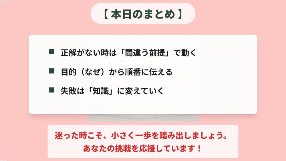 そして、ここが一番大切ですが、最初は間違っていて当たり前だ、という前提で動いてください。