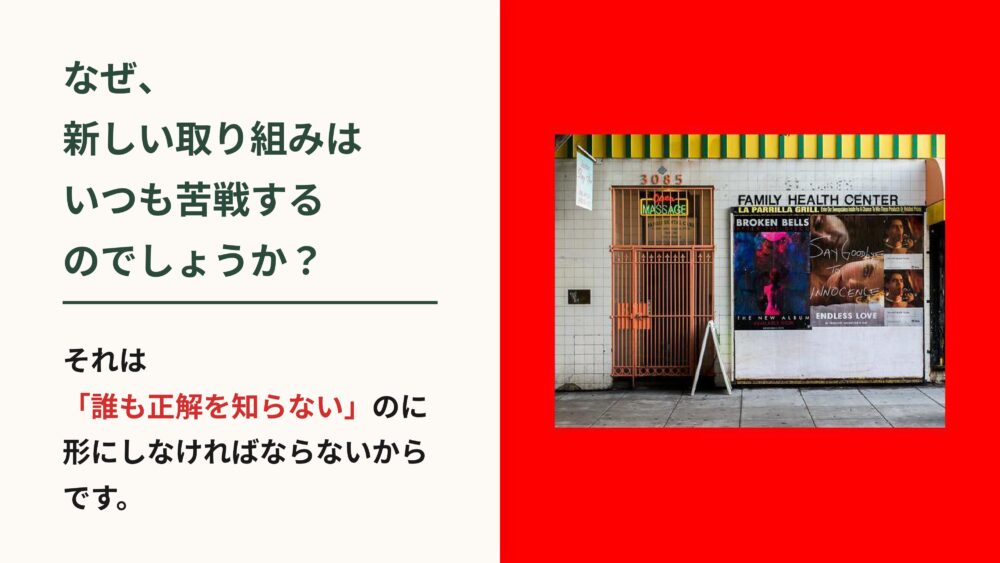 それは、誰も正解を知らない新しい挑戦なのに、最初から百点満点の完璧なものを作ろうとしていたからです。