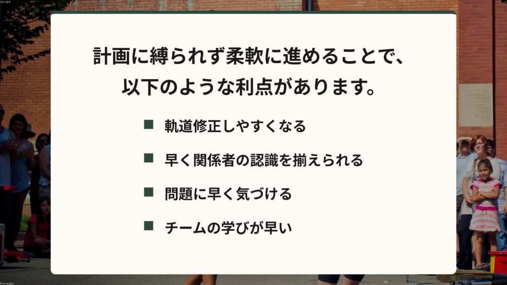 この進め方の最大の利点は、いつでも軌道修正ができることです。