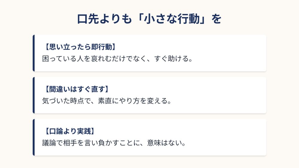 金次郎は口先で立派なことを言うよりも、まずは小さな行動を起こすことを重んじました。