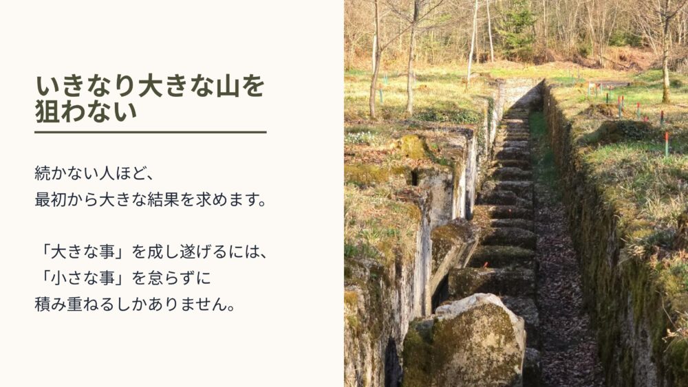 私たちは何か新しいことを始めようとするとき、ついついいきなり大きな目標を立ててしまいます。
