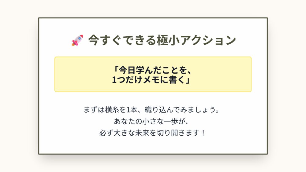 たったそれだけで、あなたは知識を行動という横の糸に変えたことになります。