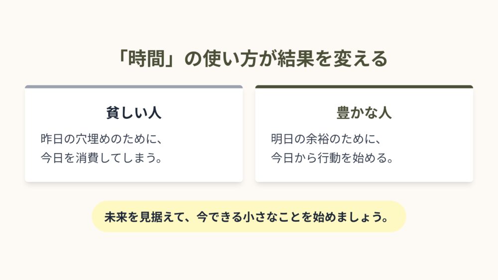 一方で豊かな人は、明日の余裕を作るために今日から行動を始めます。