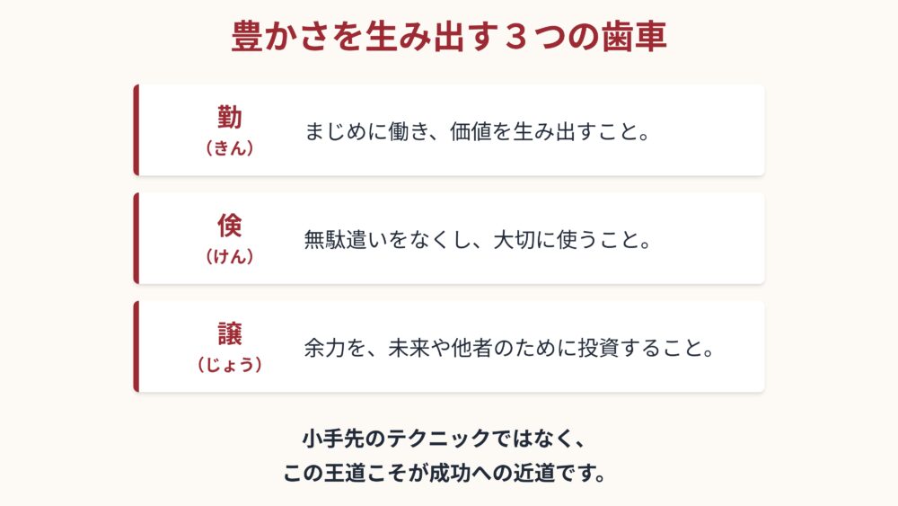 金次郎が残したこの三つの言葉は、いつの時代も変わらない豊かさの王道ルールなんです。