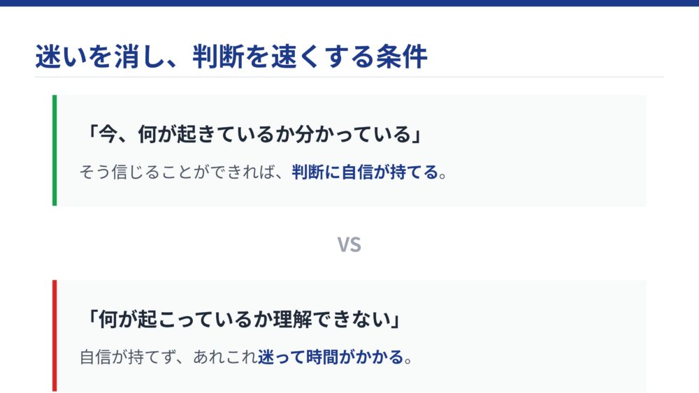 何が起こっているのか理解できない状態では、迷いばかりが生まれ、時間だけが過ぎていきます。