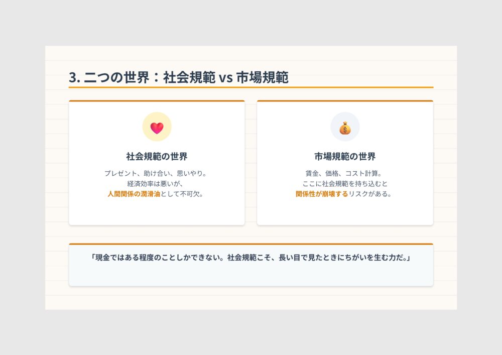 一度「お金」という物差しを持ち込むと、人間関係の温かみは消え去り、冷徹な取引のルールに書き換わってしまいます。