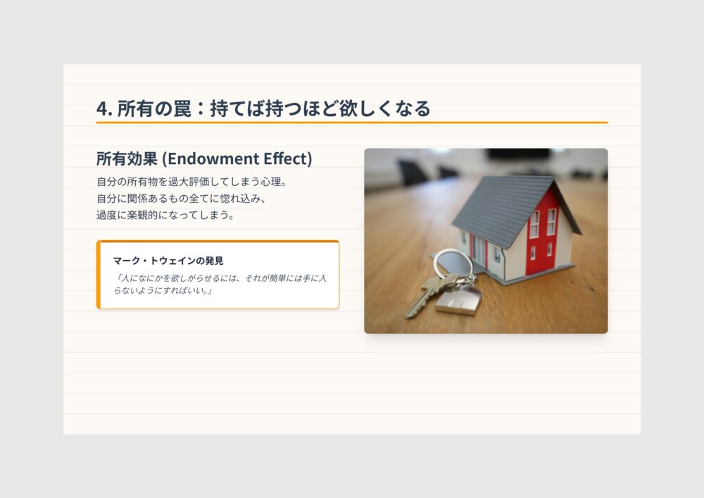 これは、一度自分のものにしてしまうと、その価値を客観的な相場よりも高く見積もってしまう心理のことです。