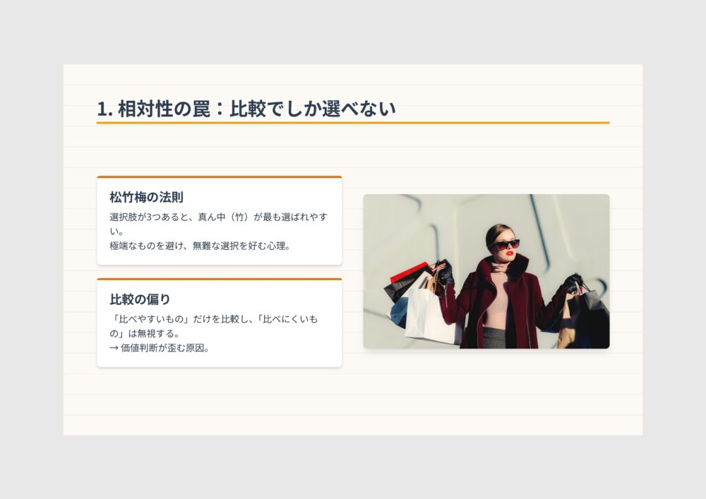 「これは本当に価値があるのか? それとも、隣の商品と比較してお得に見えているだけなのか?」と。