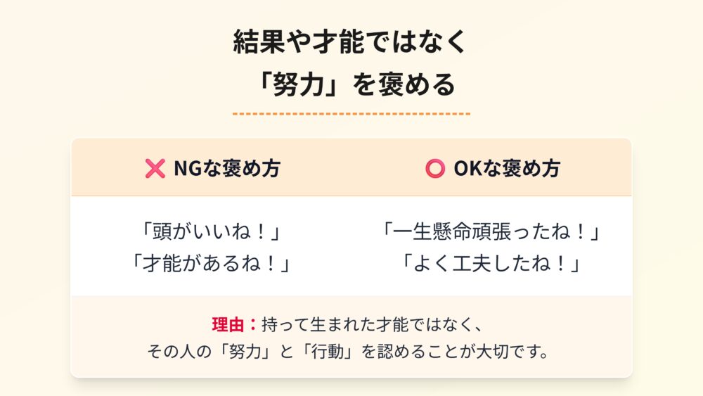 大切なのは、相手の才能や結果ではなく、その人がどう工夫したか、どれだけ頑張ったかという、過程の努力を褒めることです。