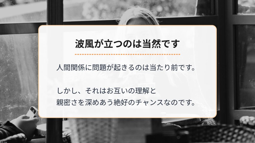 問題が起きた時というのは、実は、お互いの理解を深め、関係をより親密にしていくための、絶好のチャンスなんです。