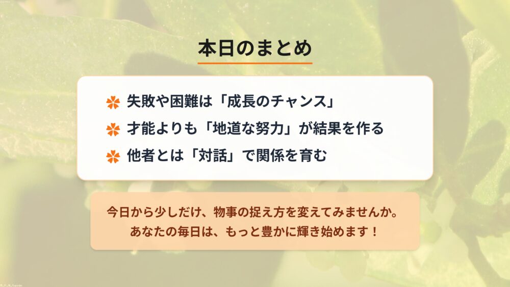 失敗した時に「自分はダメだ」と落ち込むか、「何が原因だろう」と前を向くか、その小さな違いが仕事や日々の暮らしを大きく変えていきます。