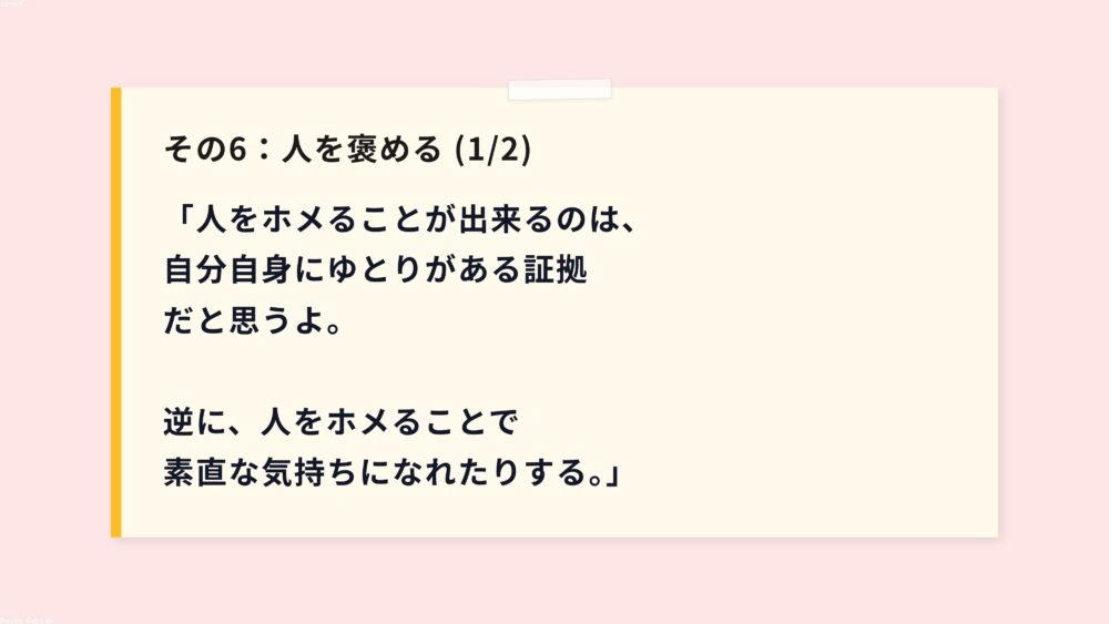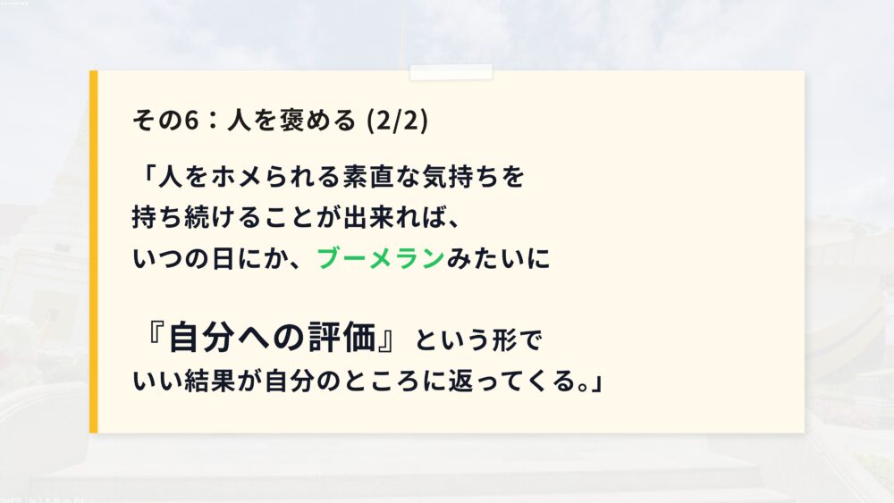 六つ目は、人を褒めることについてです。