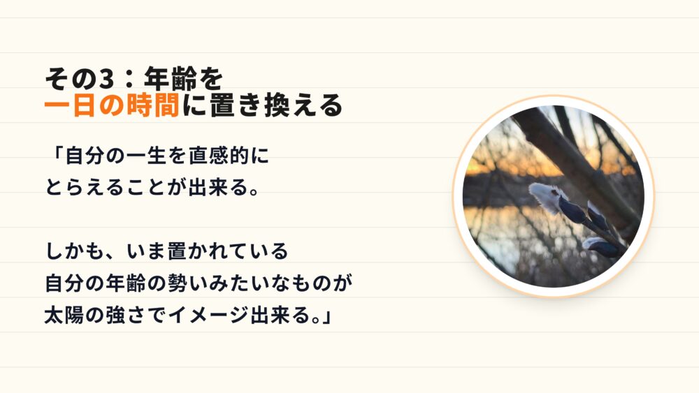 三つ目は、年齢を一日の時間に置き換える、という考え方です。