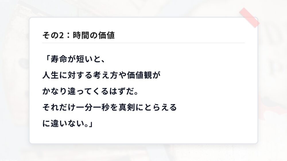 志村さんは、寿命という限りある時間を意識することで、一分一秒を真剣に捉えられる、と語っています。