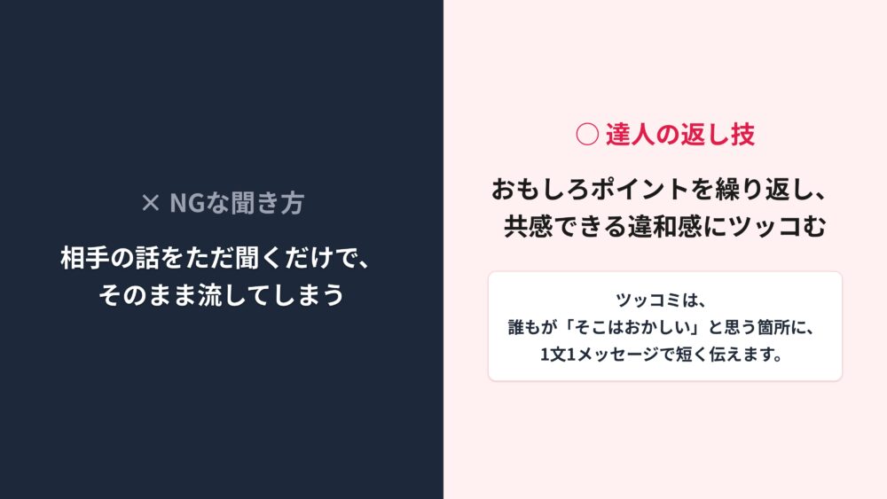 そしてさらに重要なのが、誰もがそこはおかしいと思う違和感に対して、共感しながら短くツッコミを入れることですね。
