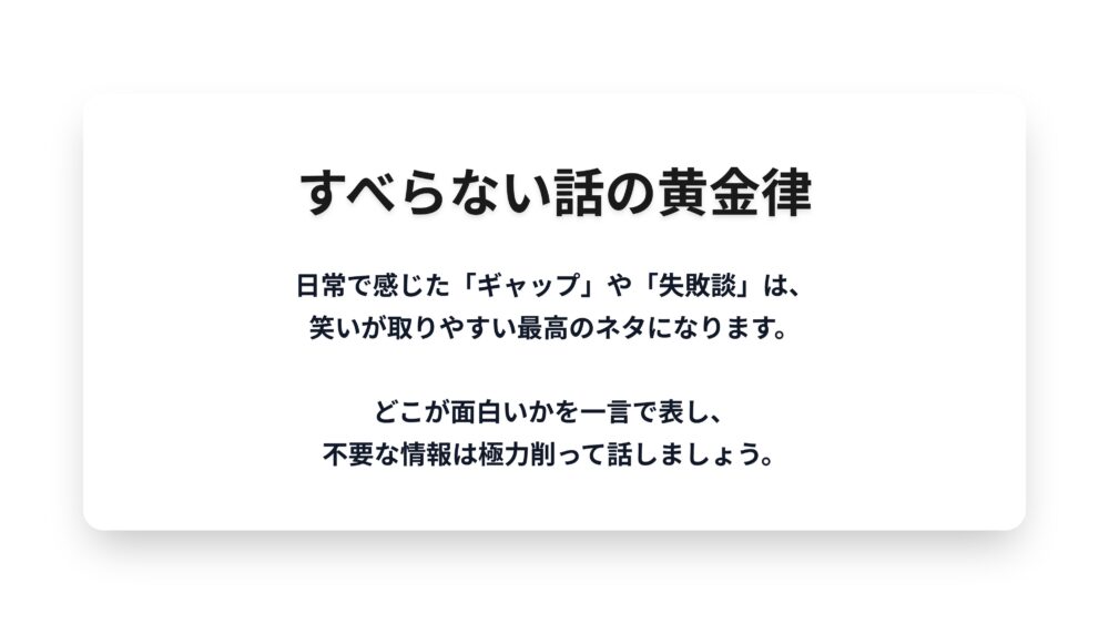 すべらない話を作る黄金律は、日常で感じたギャップと失敗談を組み合わせることです。
