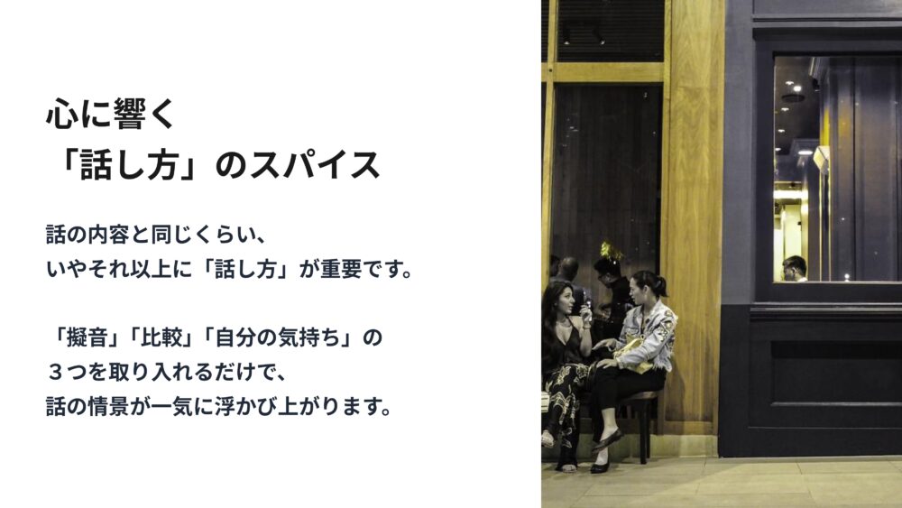 心に響く会話ができるかどうかは、話の内容以上に、話し方というスパイスが極めて重要になってきます。