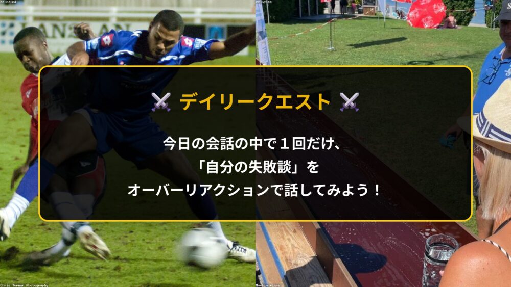 今日のデイリークエストは、今日の会話の中で1回だけ、自分のちょっとした失敗談をオーバーリアクションで話してみることです。
