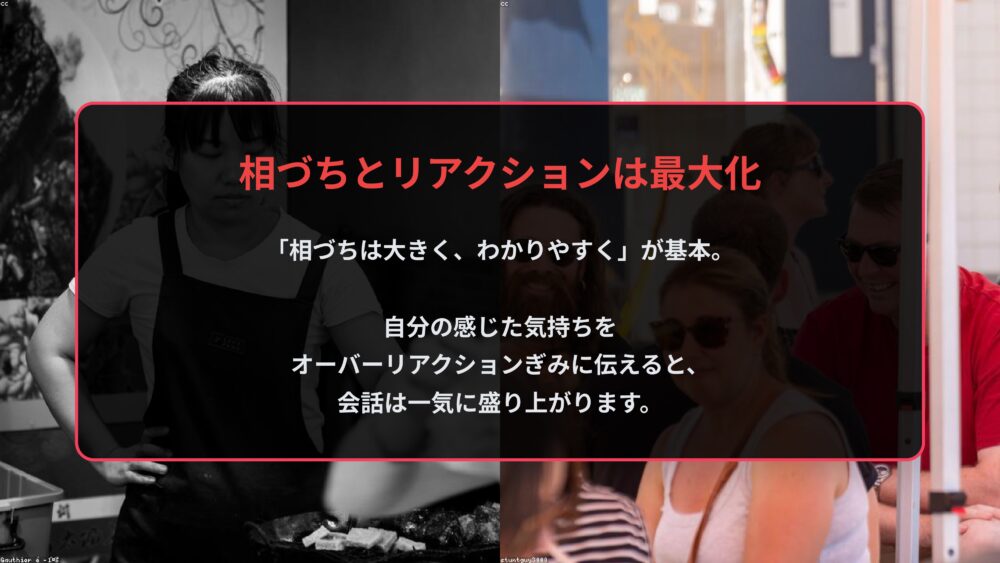 相づちとリアクションは、あなたの想像の3倍くらいオーバーにしてちょうどいいくらいです。