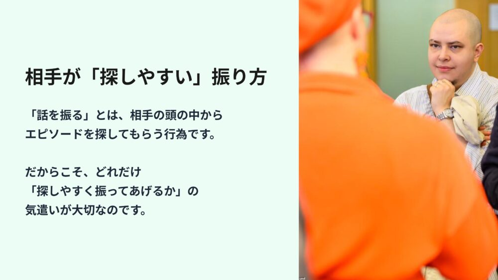 話を振るという行為は、相手の頭の中にある膨大な記憶の引き出しから、特定のエピソードを探してもらう作業のお手伝いなんです。