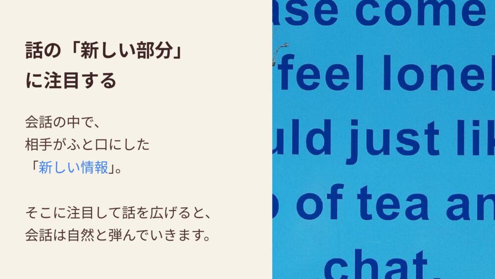 相手が差し出してくれた新しい言葉の欠片を、そっと拾い上げるだけで、会話はどこまでも広がっていくのです。