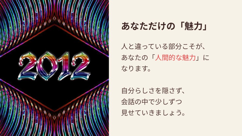 こうして会話が弾んできたとき、ふと、自分には語れるような魅力がないな、と自信をなくしてしまうことはありませんか?
