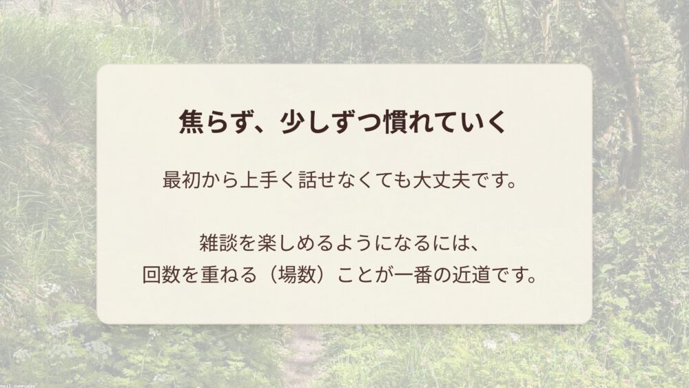 雑談を心から楽しめるようになるかどうかは、才能ではなく、単純に回数を重ねているかどうか、つまり場数で決まります。