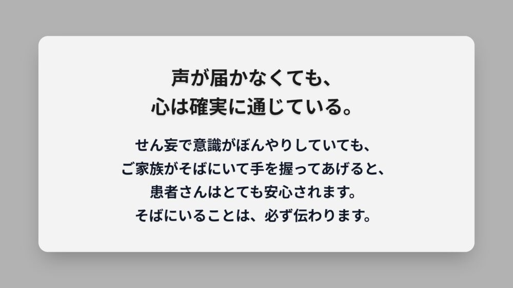 意識がぼんやりしているように見えても、誰かがそばにいてくれるという気配や温もりは、患者さんにしっかりと伝わっています。