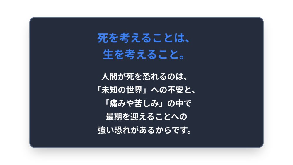 それは、どうなってしまうのかという未知の世界への不安と、大きな痛みや苦しみへの恐怖があるからです。