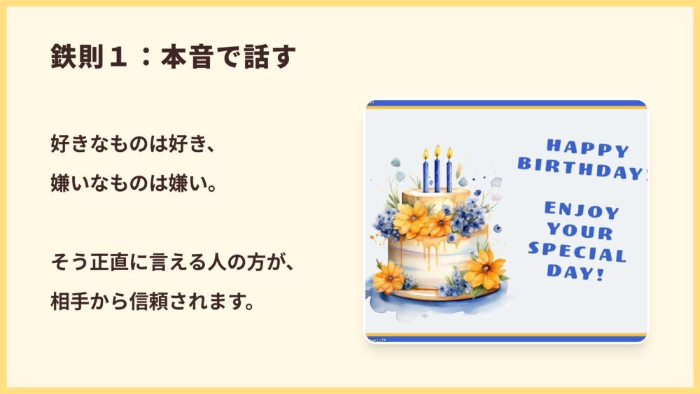 このお話には、さらに続きがありまして、本音を隠したまま、相手と深く仲良くなることはできません。