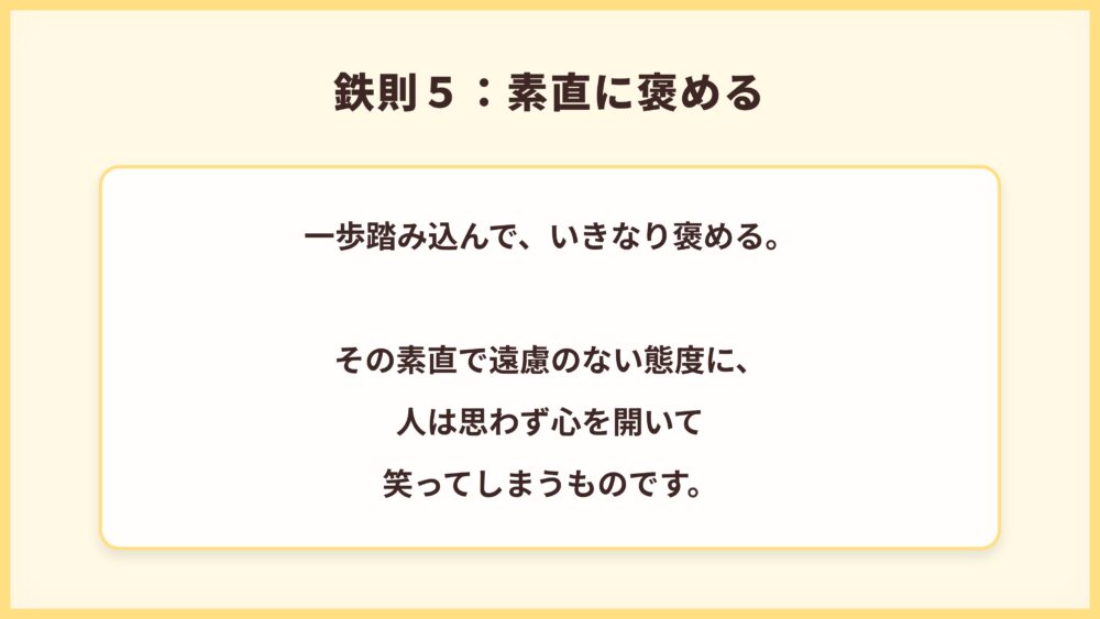 そして五つ目は、恥を恐れずに素直に褒めること。