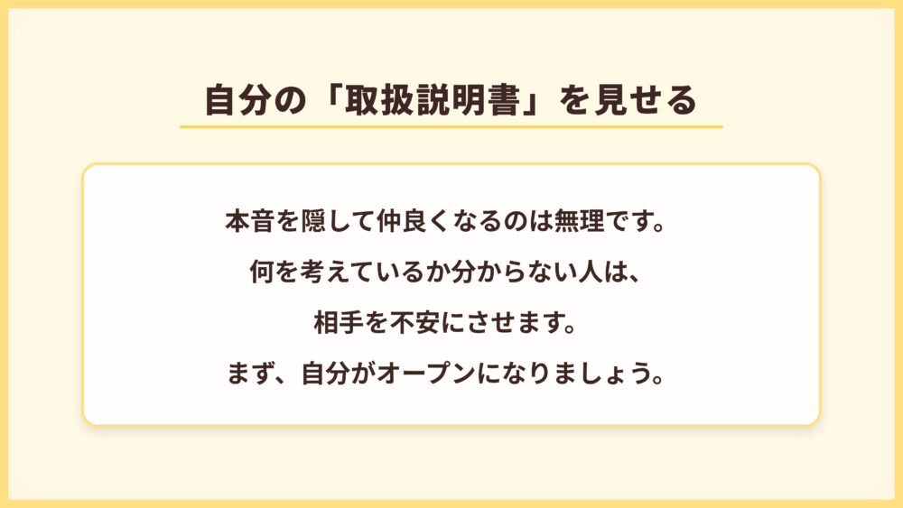 本音や自分のキャラクターを見せることは、いわば自分の取扱説明書を相手に渡すようなものです。