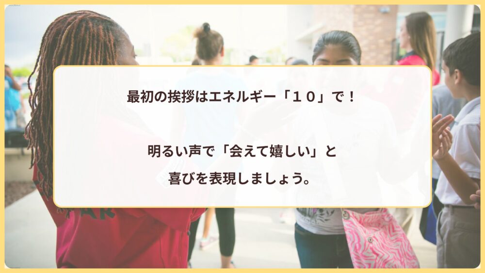 開口一番の挨拶をエネルギーマックスで元気よく行うこと。