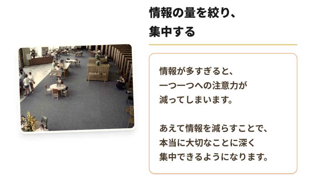 最後に、あえて情報の量を絞ることで、本当に大切なことに集中できるようになります。