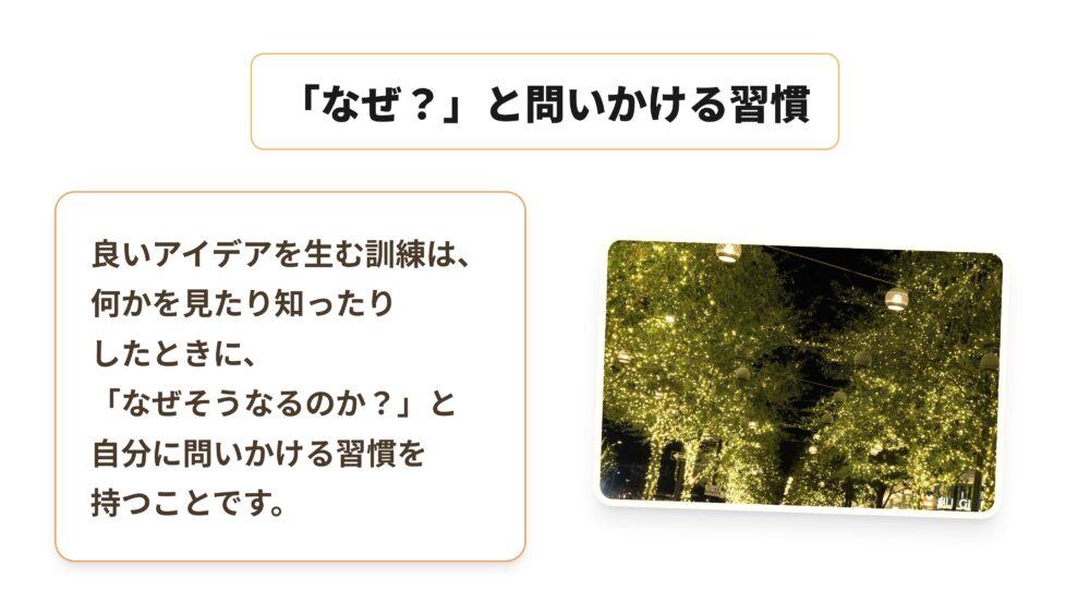 良いアイデアを生むには、常になぜと自分に問いかける習慣が大事です。