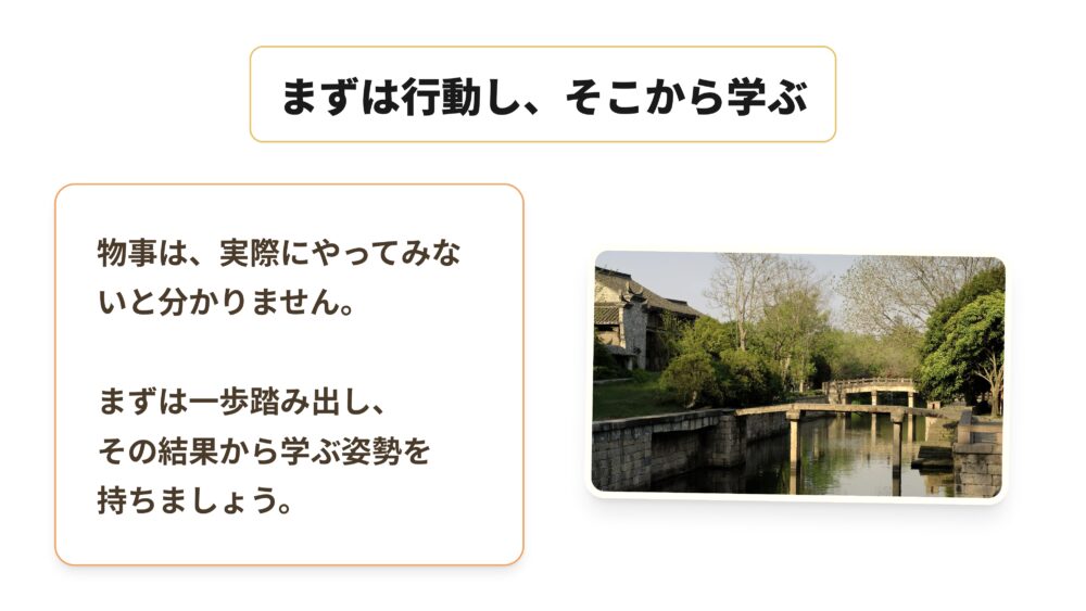 失敗を恐れず、まずは一歩踏み出し、その結果から素直に学ぶ姿勢を持ち続けましょう。