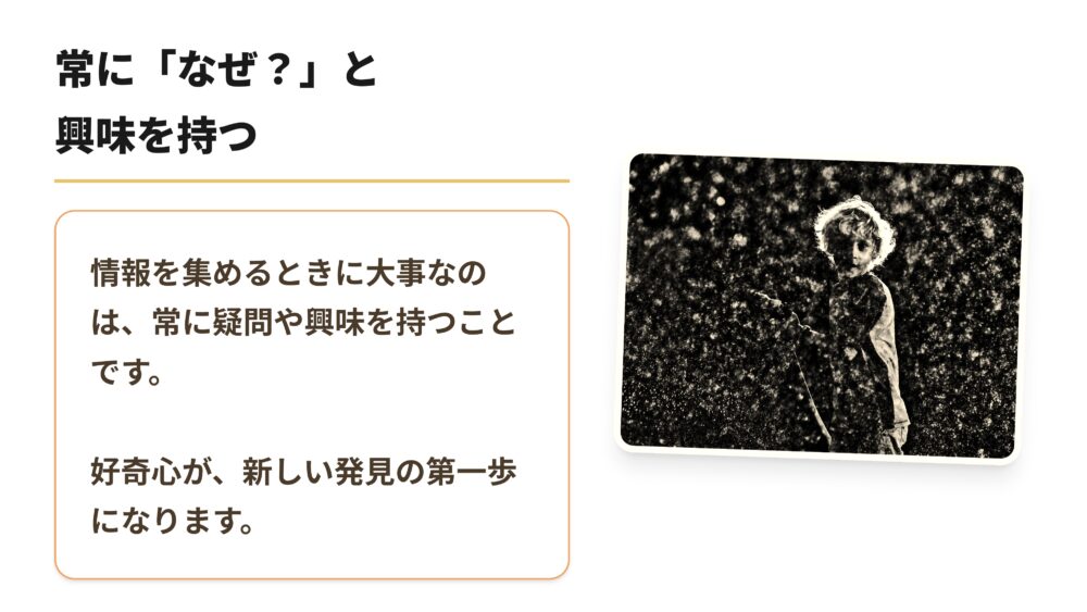 情報を集めるときは、常に、なぜ、という疑問や好奇心を持つことが大事です。