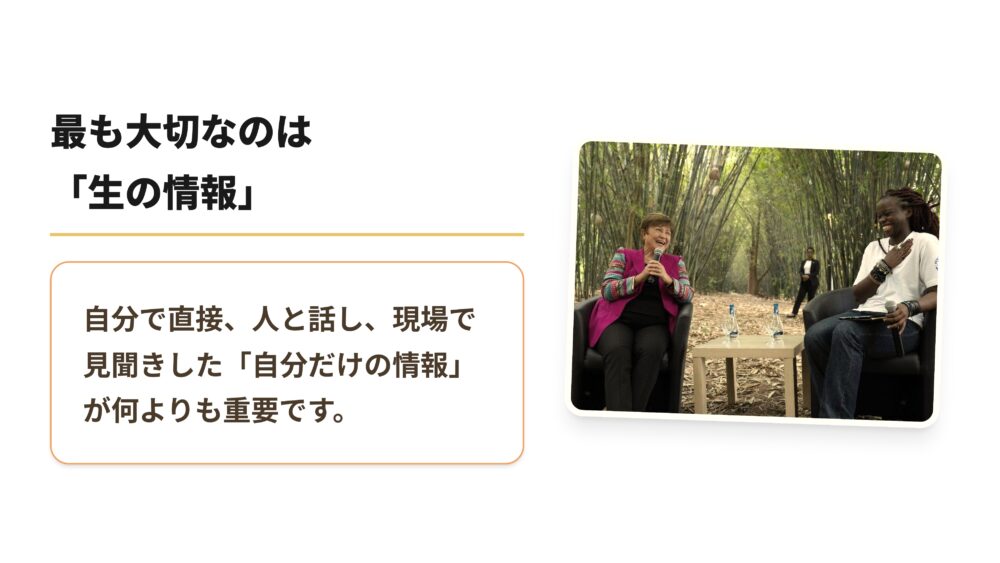 だからこそ、自分で直接見聞きする生の情報が、何よりも大切なのです。
