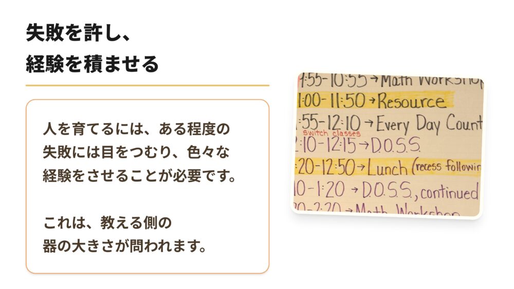 人を育てる場面では、失敗を許し、経験を積ませる器の大きさが求められます。