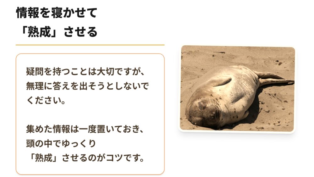 疑問を持っても無理に答えを出さず、頭の中で情報を熟成させることも重要です。