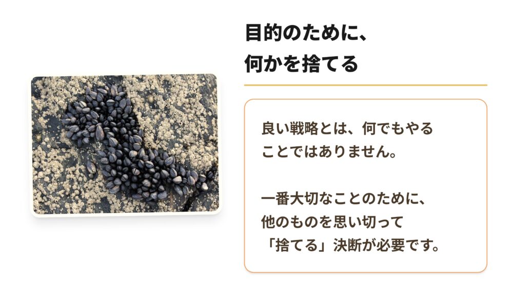 一番大切な目的のために、何かを捨てる決断が、本当の意味での戦略です。