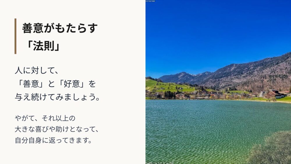人に善意と好意を与え続けていると、必ず自分に返ってくるという不変の法則があります。