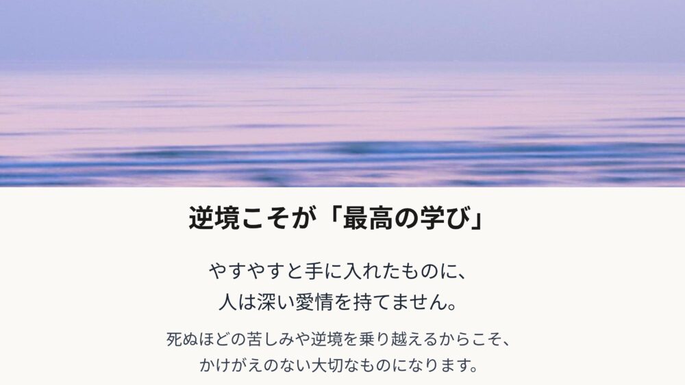 逆境は、あなたがこれから手にするものの価値を何倍にも高めてくれる、最高の学びの機会なのです。