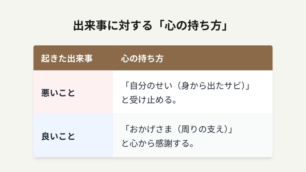 一つ目は、悪いことは自分の責任として受け止め、良いことは周りのおかげだと感謝すること。
