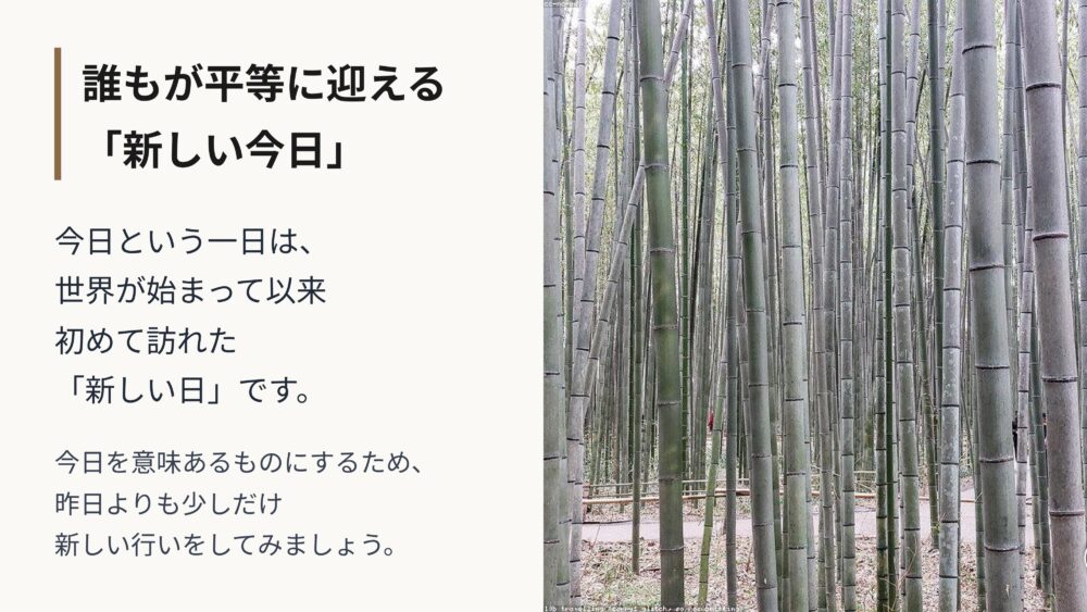 だからこそ、今日という日を少しでも意味のあるものにするために、昨日とは違う新しい行いを一つだけ取り入れてみてほしいのです。