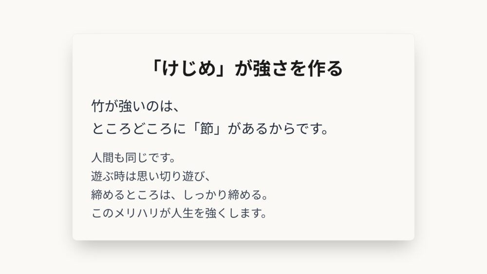 このメリハリ、つまり人生の節をしっかり作ることが、困難に負けない強さを生み出します。