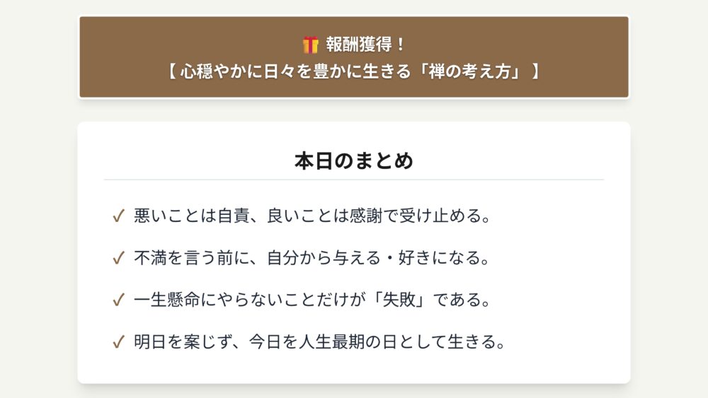 ここまで見てくださったあなたは、すでに心穏やかに日々を豊かに生きる禅の考え方を手に入れましたね。