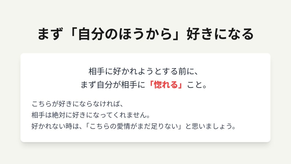 しかし、自分が心を開いて好意を持たない限り、相手があなたを好きになってくれることは絶対にありません。