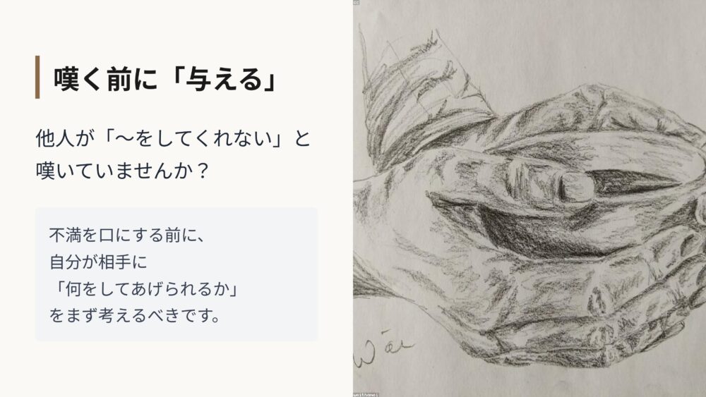 不満を口にする前に、目の前の人に何ができるかを考える習慣が、あなたの心を豊かにしてくれます。